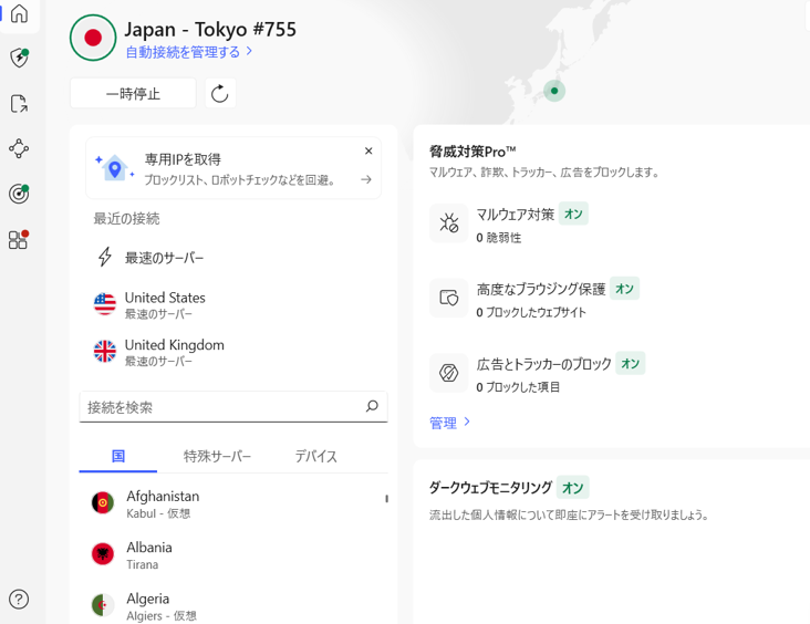 - 60カ国以上のサーバー:世界中に広がるサーバーネットワークで、快適な接続が可能。